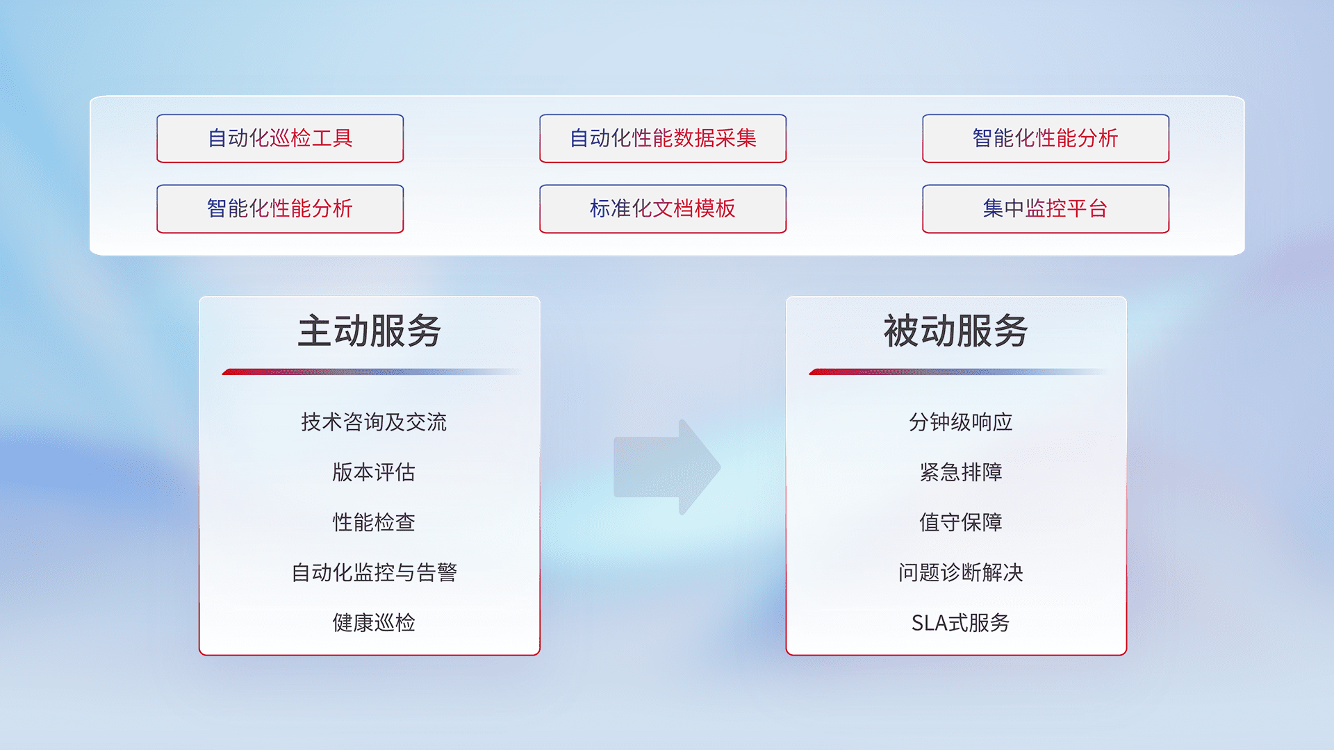 智能化工具和标准化文档,,保障服务质量,,,,提供主动服务(包含技术咨询、、版本评估、、、性能检查、、、、自动化监控与告警、、、健康巡检)和被动服务包含(分钟级响应、、、紧急排障、、、值守保障、、、、问题诊断解决、、、SLA服务)。。